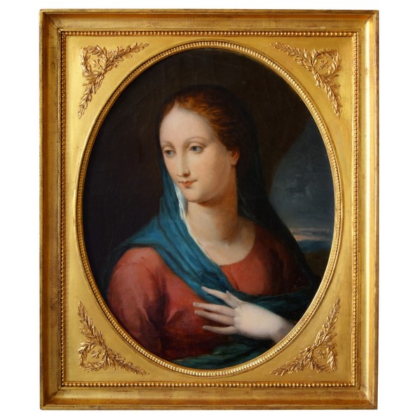 Early 19th century French school, portrait of repenting Saint Mary Magdalene. Oil on walnut panel in a beautiful gold leaf gilt wood frame.