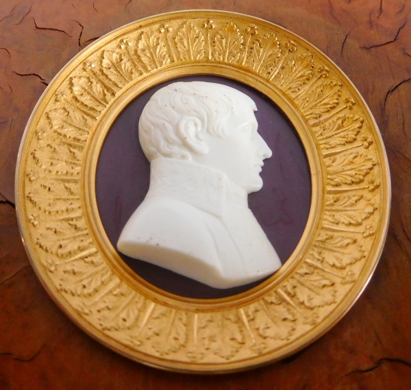 Empire sculpted ivory miniature featuring Napoleon Bonaparte set into an finely chiseled ormolu ovale and a burl wood frame.