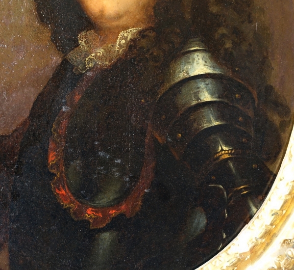 Late 17th century French school, portrait of an officer wearing a beautiful black wig and his blackened and gilt steel armour, Louis XIV period. Set into its original gold leaf gilt sculpted wood frame.