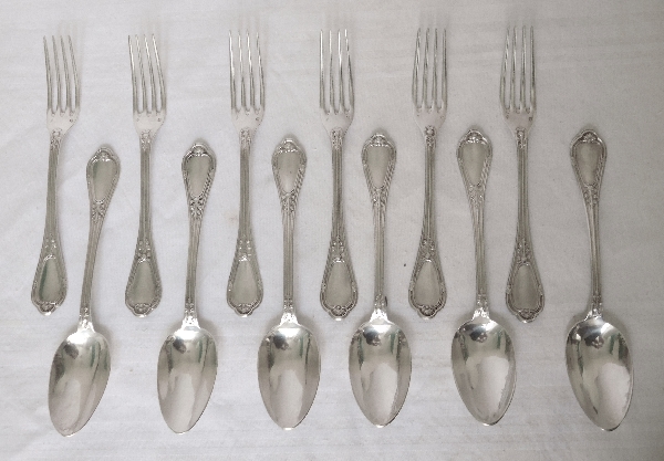 Belle série de 6 couverts à dessert (12 pièces : 6 fourchettes, 6 cuillères) de style Régence en argent massif.