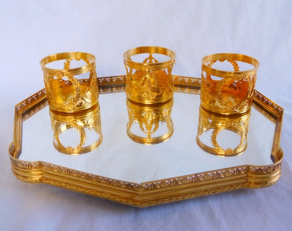 Exceptionnel service à liqueur en cristal de Baccarat et son plateau en vermeil sur fond de miroir. Travail parisien de style Empire, d'époque 1900.