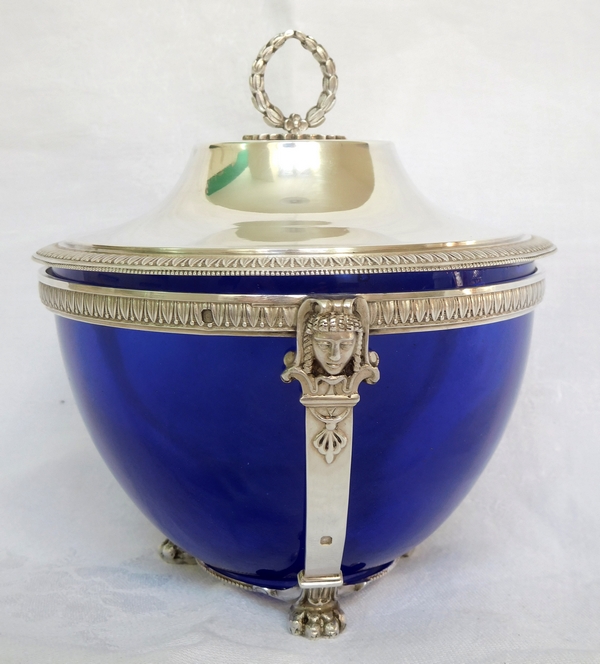 Sucrier, drageoir ou confiturier en argent massif et cristal de Baccarat bleu cobalt, beau décor de style Empire - Retour d'Egypte, époque fin XIXe siècle ou vers 1900.