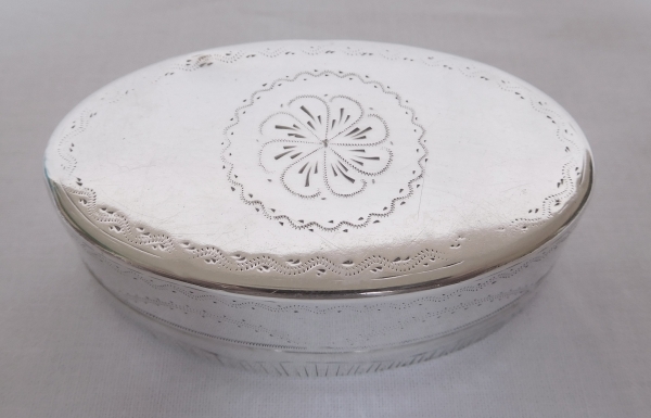 Boîte tabatière en argent massif à décor ciselé et gravé de fleurs, paysages, rosaces, intérieur en vermeil. Travail Français de la fin XVIIIe siècle - début XIXe siècle. Elle porte le poinçon de l'Association des Orfèvres.