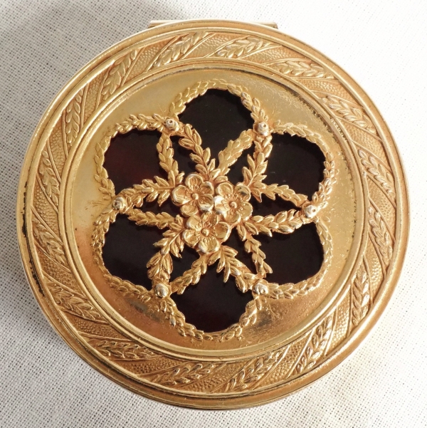 Belle boîte à boutons de manchettes en vermeil (argent massif doré à l'or fin), de forme circulaire, ornée d'un très fin décor ciselé de style Louis XVI, le couvercle ajouré laissant apparaître une plaque d'écaille de tortue. L'intérieur est en vermeil également. Epoque fin XIXe siècle ou vers 1900.