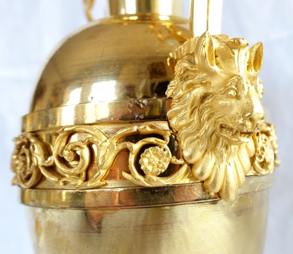 Belle paire de cassolettes / paire de vases en bronze doré au mercure, de forme ovoïde, ceinturées d'une frise d'enroulements de feuilles d'acanthe ; elles reposent sur une base carrée en marbre blanc. Les poignées latérales sont soutenues par des masque de chimère (animal fantastique mi lion, mi chèvre, dont on reconnait le mufle du lion, les oreilles et les cornes de la chèvre). Les poignées se terminent par des enroulements en relief, très gracieux. Travail d'époque Directoire-Consulat, dernières années du XVIIIe siècle ou vers 1800, attribué à Claude Galle.