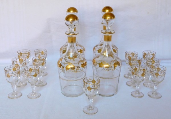 Verrerie en bon état, quelques usures à la dorure. complète de ses 4 carafes intactes, il manque 3 verres (13 verres présents sur les 16).