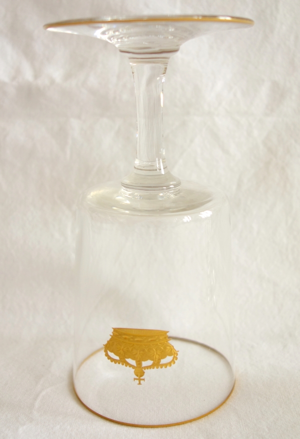 Si la première page des catalogues de Baccarat dans les années 1900 représente des exemples de personnalisations que l'on pouvait demander à la manufacture de Baccarat, avec des monogrammes, des armoiries et des couronnes, nos verres sont l'exemple le plus prestigieux, la commande spéciale d'un roi à Baccarat d'un service de verres gravé d'une couronne royale, gravée à la roue (à la main bien sûr !) et dorée à l'or fin.