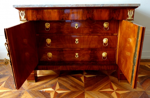 Ce meuble raffiné est dit commode à l'anglaise puisque l'ouverture des deux battants découvre une série de 3 tiroirs plaqués d'acajou. Un autre tiroir en ceinture. Belle garniture de bronzes ciselés et dorés au mercure, tels que lyre, entrées de serrure, mufles de lion. La jointure entre les 2 battants est cachée par un bronze simulant un jonc de roseau avec une rosace articulée pour cacher l'entrée de la serrure. Notre beau meuble est recouvert d'un épais marbre rose du Languedoc (coloris très rare pour un meuble Empire). Ce dernier est bien d'origine, puisque l'on sent les vagues de la coupe à la scie à eau en passant la main dessous. Fabrication parisienne de la fin de l'époque Empire, années 1810.