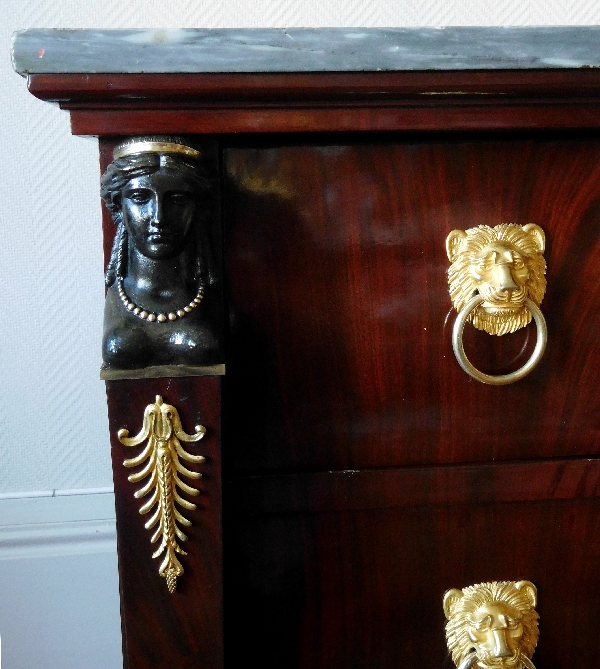 Grande commode en plaquage d'acajou flammé sur caisse en chêne. Belle garniture de bronzes patinés et dorés : bustes de femme à l'antique aux seins apparents, palmettes, têtes de lions, entrées de serrures ornées de chimères. Notre commode est coiffée d'un marbre bleu turquin et ouvre par 3 grands tiroirs. Elle repose sur des pieds patiné façon bronze (antérieurs en griffes et posterieurs en chapelet). Très belle production parisienne d'époque Consulat vers 1800.