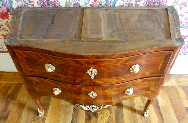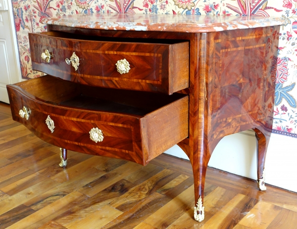 La commode est en excellent état, vernis au tampon refait à neuf par notre ébéniste, le plaquage est superbe. Belle garniture de bronzes, les poignées rocailles sont très belles, anciennes, mais pas d'origine.