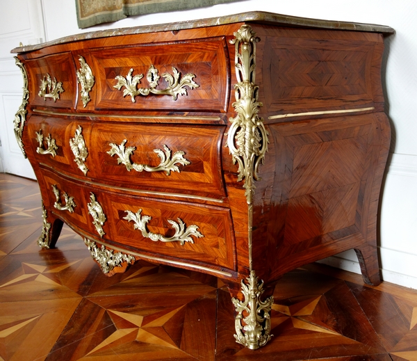 Elle ouvre par 5 tiroirs (2 grands, 2 plus petits en haut); structure en chêne ; elle est coiffée d'un marbre rouge brun du Languedoc mouluré en bec de corbin (rapporté). Riche garniture de bronzes ciselés typique du style rocaille. Notre commode se caractérise par le jeu des courbes et contre courbes (tiroirs concaves et convexes). Elle n'est pas estampillée mais sans aucun doute le travail d'un grand maître parisien.