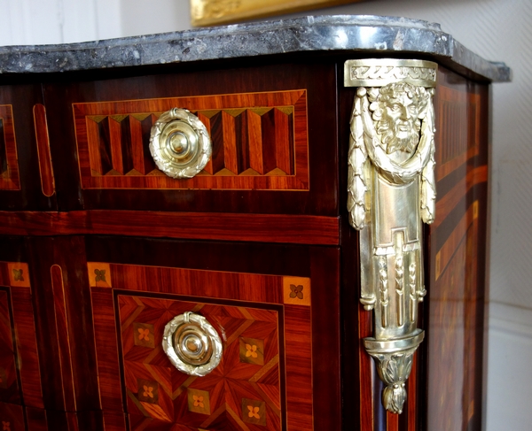 Grande commode sauteuse d'apparat en marqueterie dite à la Reine, créant des illusions d'optique en simulant des motifs en trois dimensions. Riche garniture de bronzes ciselés dont on notera les importantes chutes d'angles ornées de têtes de génies barbus. Notre commode a gardé son épais marbre d'origine gris Sainte-Anne non recoupé (débordant à l'arrière pour s'appuyer contre une boiserie basse).