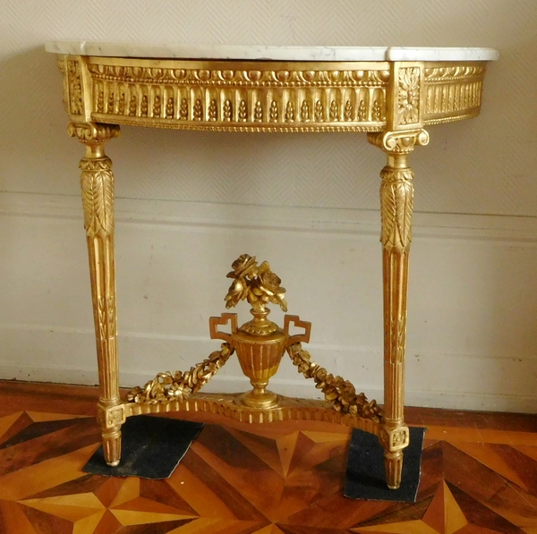 Belle console en bois doré richement sculptée à montants cannelés rudentés à asperges terminant par des chapiteaux ioniques et de longues feuilles d'acanthe, la ceinture cannelée rudentée, un vase de fleurs sur l'entretoise. Epais plateau de marbre blanc mouluré. Travail d'époque Louis XVI, années 1780.