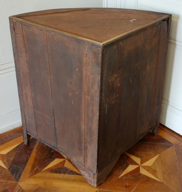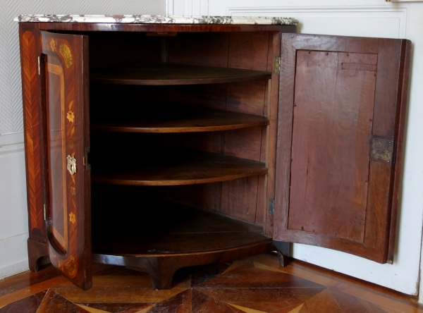 Belle encoignure d'époque Transition Louis XV - Louis XVI en marqueterie, XVIIIe siècle.