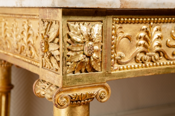 Importante console rectangulaire en bois sculpté et doré. Elle repose sur 4 pieds fuselés à cannelures à asperges soulignés de chapiteau à enroulement et réunis par une entretoise ornée de rang de piastres et d'un vase chargé de fleurs. La ceinture ornée de palmettes et de dés de raccordement à rosaces en fort relief. Elle coiffée d'un plateau de marbre blanc à cavet. Epoque Louis XVI, travail parisien attribuée à Georges Jacob.