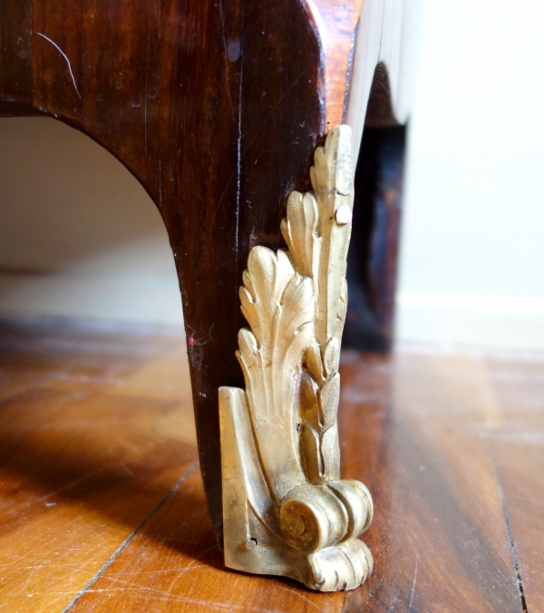 Bon état général, nous avons fait nettoyer et repolir le vernis ancien. Belle garniture de bronzes ciselés et dorés à l'or fin, rapportés au XIXe siècle. Marbre d'origine et intact.