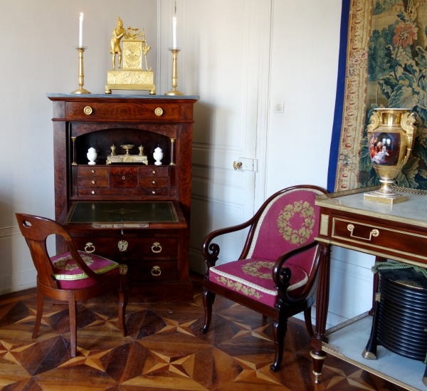 Beau secrétaire sur plinthe en plaquage d'acajou flammé, garniture de bronzes dorés au mercure, coiffé de son marbre de luxe de couleur bleu turquin. Il ouvre par 4 tiroirs et l'abattant découvre un théatre avec de belles finitions (tiroirs, niches en acajou garnies de bronze doré) et un beau cuir vert (d'origine) doré aux petits fers. Fabrication parisienne soignée de style Empire et d'époque Restauration, début XIXe siècle vers 1820).