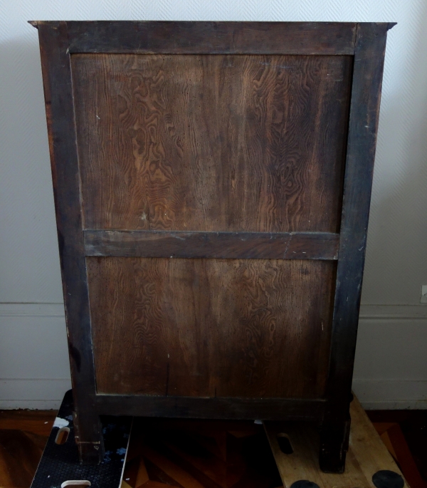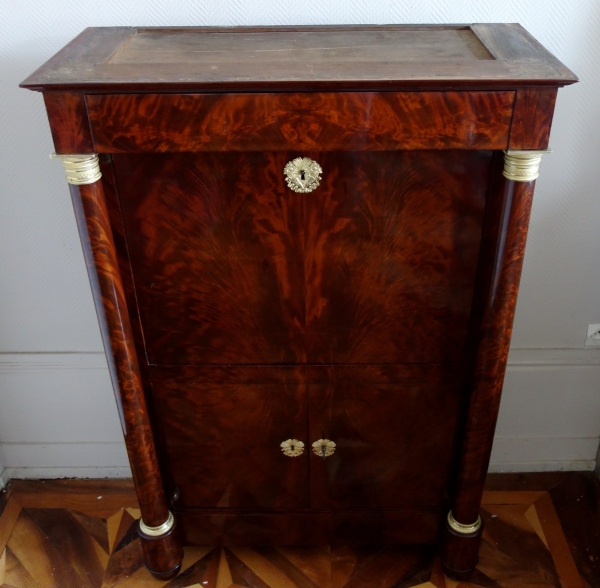 Production parisienne des années 1815-1820 , notre secrétaire est une production haut-de-gamme qui se caractérise par de belles finitions : superbe flamage de l'acajou sur toutes les surfaces, miroir au mercure et colonnes baguées dans la niche, portes plaquées d'acajou y compris sur les versos et intérieur du placard plaqué d'acajou, ce qui est très rare.