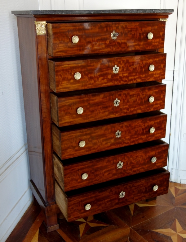 Beau semainier en plaquage d'acajou moiré. Montants à pilastres ornés de bronzes à aigles, il ouvre par 6 tiroirs. Riche garniture de bronzes ciselés. Plateau de marbre gris foncé.