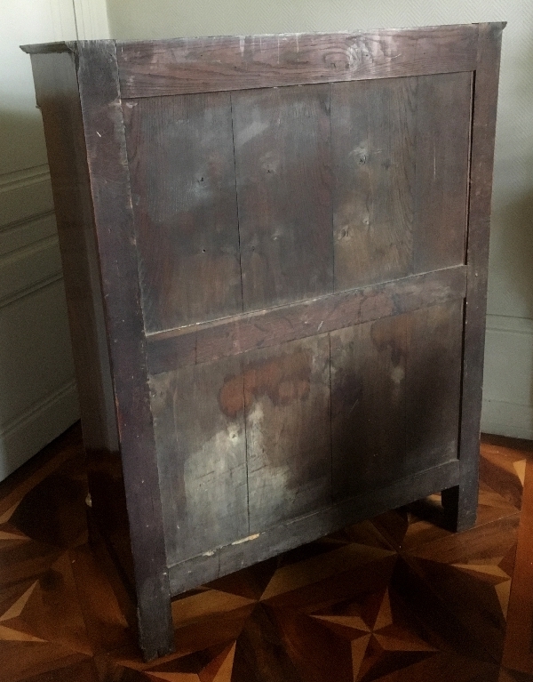 Belle fabrication parisienne (intégralement sur chêne) meuble de belle facture, d'une grande qualité d'exécution (superbes montages à queues d'aronde) et aux matériaux de luxe (bronze doré, acajou flammé). Non estampillé.