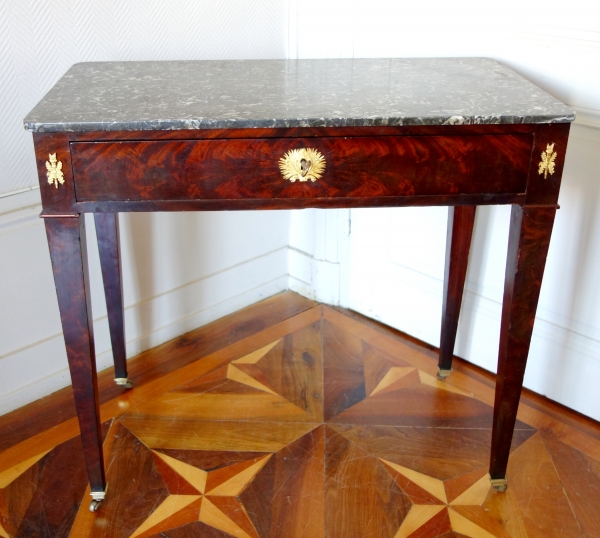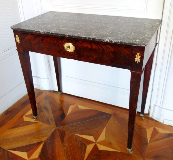 Petite table à écrire ou table console de salon en plaquage d'acajou sur toutes les faces, ouvrant par un tiroir en ceinture. 4 pieds en gaine montés sur des roulettes. Belle garniture de bronzes ciselés et dorés au mercure. Elle est coiffée d'un marbre gris Sainte Anne. Style Empire du début XIXe siècle, époque Restauration.