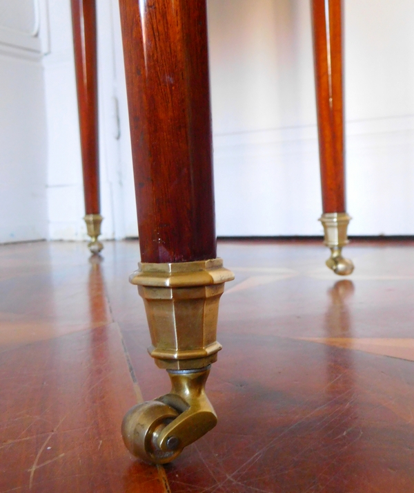 De par ses finitions luxueuses mais plus particulièrement la forme particulières des pieds fuseaux octogonaux. Le modèle s'adresse à un public averti, il semble sobre au premier regard mais la forme des pieds à 8 pans change tout. Notre table est à rapprocher des productions des meilleurs ébénistes parisiens tels que Jacob ou Molitor qui ont tous deux utilisé cette forme. Elle est sans aucun doute l'oeuvre de l'un d'entre eux.