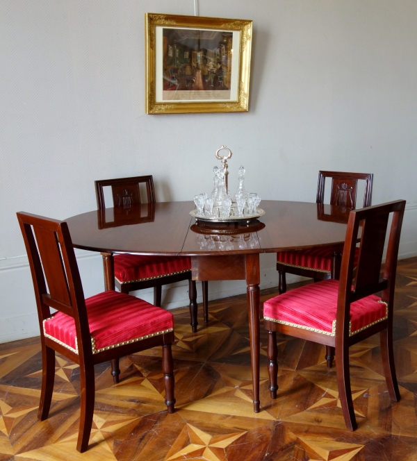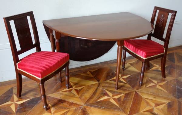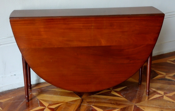 Rare table de salle à manger pliante dite gateleg en acajou massif, chêne et plaquage d'acajou, le tout verni au tampon de manière traditionnelle. Pliée, elle prend la forme d'une mince console à placer le long du mur. Deux pieds sur 4 sont articulés par un astucieux mécanisme qui leur permettent de se déplier à 90° et ainsi de remonter une ou deux allonges. Fin de l'époque Louis XVI, vers 1790 juste avant la Révolution. Elle porte l'estampille d'un des plus prestigieux ébénistes de l'ancien Régime : JF LELEU