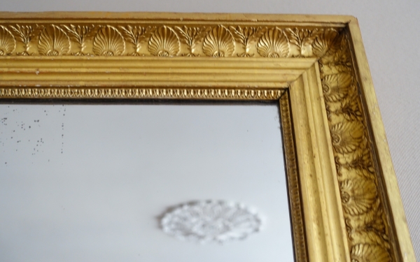 Belle glace de cheminée d'époque Empire, beau cadre à moulures de palmettes Empire, doré à la feuille d'or, et garni de sa glace au mercure en 2 parties, sans tache et pailletée en bas.