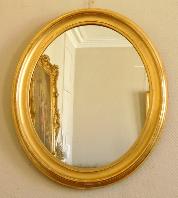 Miroir ovale en bois doré d'époque XIXe siècle. Le cadre est doré à la feuille d'or, la glace au mercure.