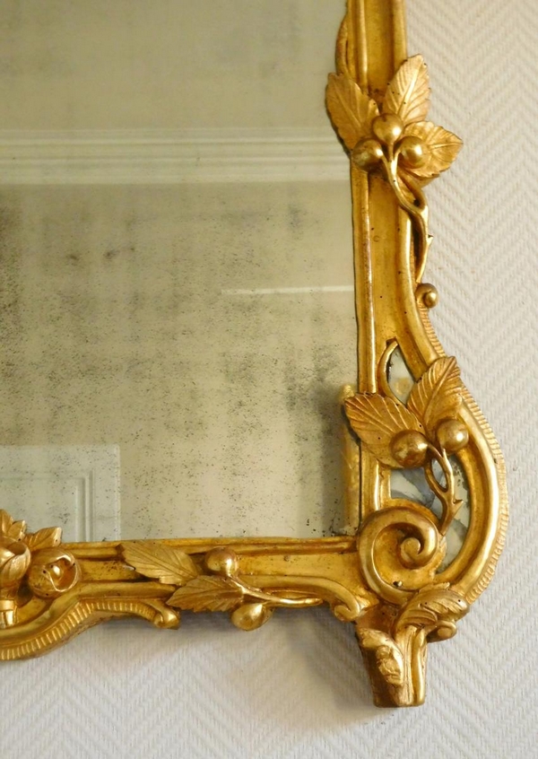 Grande glace à pare-closes en bois sculpté et doré, glace au mercure, dorure à la feuille d'or.