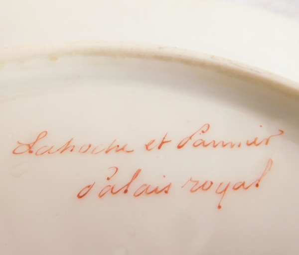 Partie de service de table en porcelaine de Paris émaillée de couleur abricot, modèle à bords polylobés le marli et le bord soulignés de filets or et rouge. Il comprend douze assiettes, un plat à gâteau, une coupe sur piédouche et une saucière. Vers 1860, époque Napoléon III. Toutes les pièces sont signées, certaines de Lahoche et Panniers, d'autres avec également la mention Escalier de Cristal.