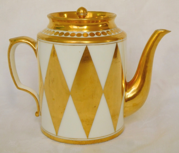 Beau décor doré à l'or fin intégralement bruni à l'agate en or poli, belle dorure épaisse profonde qui n'a pas été utilisée "à l'économique". Le décor se caractérise par la grande originalité du motif de losanges directoire sur toute la hauteur. Ils créent un effet faussement simple qui est en fait d'une grande sophistication, moderne, quasi précurseur de l'Art Déco avec plus de 100ans d'avance.