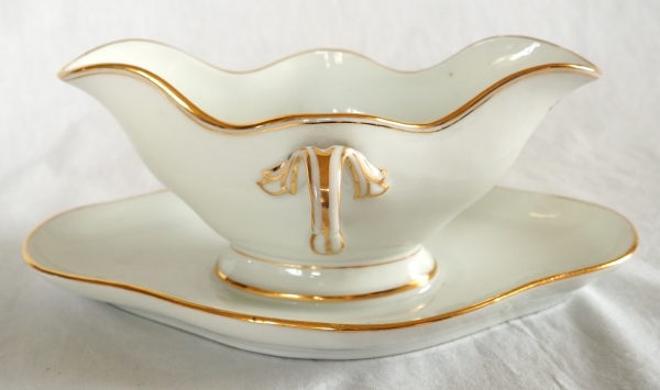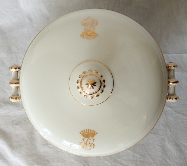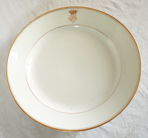 Service de table en porcelaine rehaussée de filets d'or fin, chaque pièce décorée à l'or d'un monogramme JL surmonté d'une couronne de comte. Production de la seconde moitié du XIXe siècle, époque Napoléon III vers 1860.