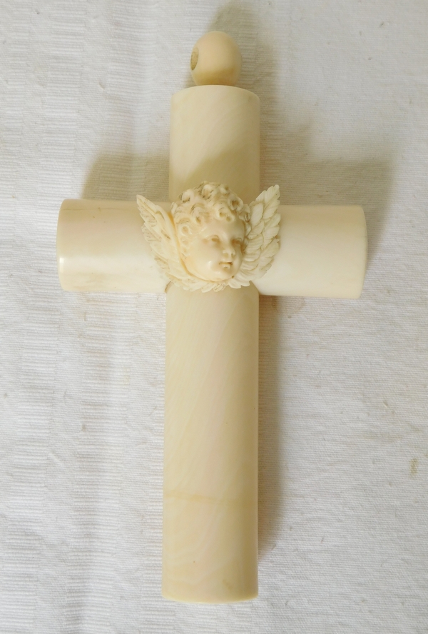 Croix de berceau tubulaire en ivoire décorée d'une tête d'angelot, époque fin XIXe siècle (ivoire bien antérieur à 1947 et non soumis à la Convention de Washington).