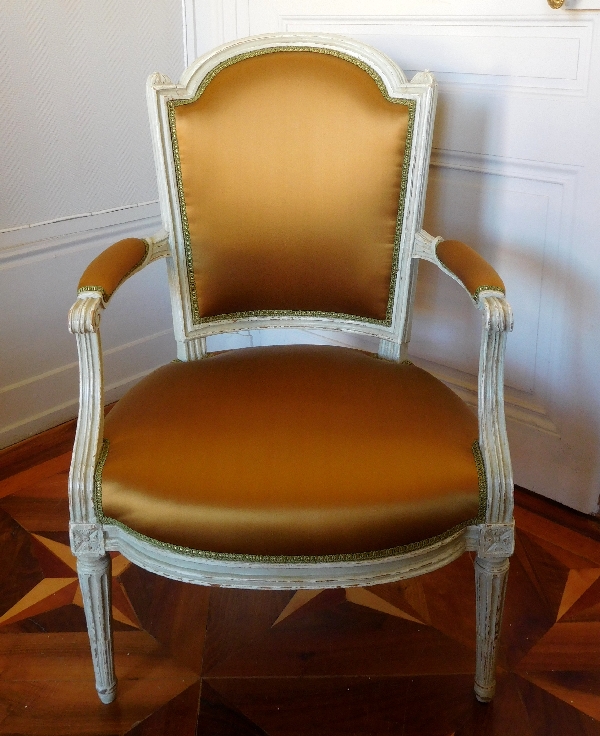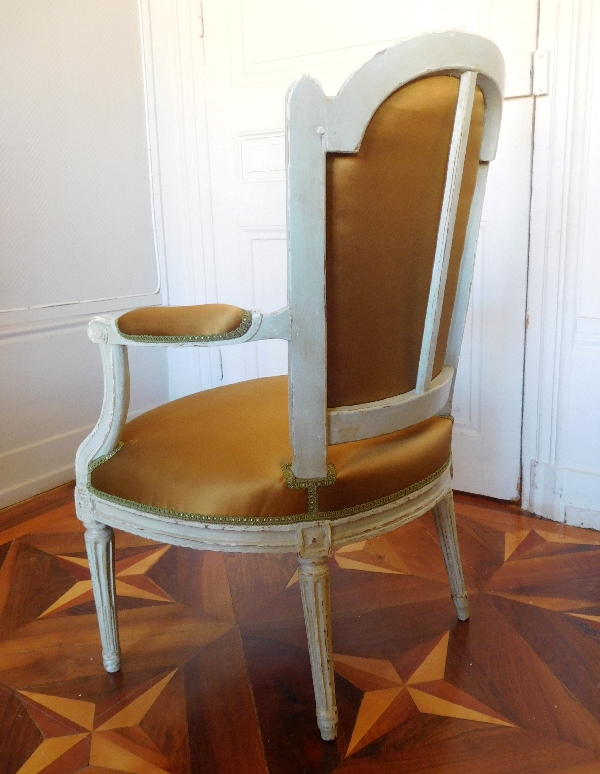 Rare série de 4 fauteuils cabriolets à chapeau de gendarme, en bois sculpté et mouluré, relaqué gris vert, époque Louis XVI, estampille de Nadal l'Ainé.