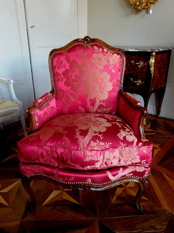 Elle est recouverte à neuf d'un somptueux tissu fleuri 100% soie de Tassinari et Châtel dont la subtile couleur rose framboise change en fonction de l'angle de vue et de la luminosité, révélant des reflets dorés.