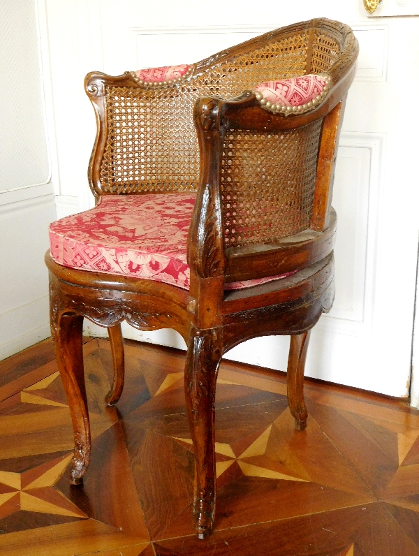 Fauteuil de bureau Régence dit fauteuil de cabinet en noyer mouluré et sculpté, assise et dossier canné, époque XVIIIe siècle vers 1730-40. Il s'agit probablement d'un modèle Lyonnais.