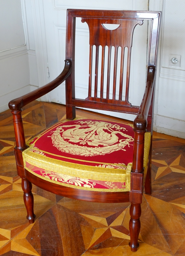 Pour ce fauteuil historique, nous avons fait faire une restauration de qualité Mobilier National : vernis au tampon, garniture crin en "lame de couteau", que nous avons recouvert d'une soie ancienne d'époque Empire, rouge framboise à motif placé jaune, rehaussé d'un double galonnage fil d'or.