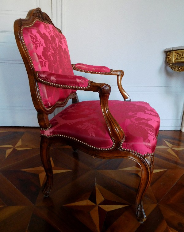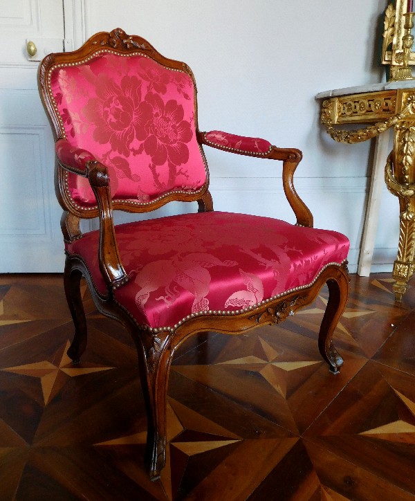 Luxueux fauteuil à la Reine en noyer sculpté d'époque Louis XV, vers 1750, travail Lyonnais ou de la vallée du Rhône.