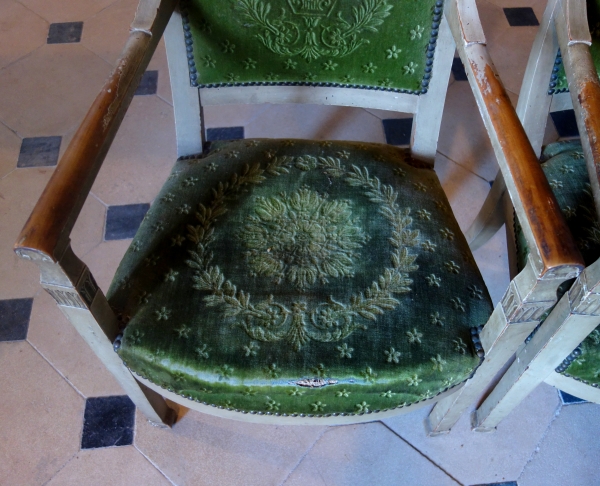 Les sièges sont garnis d'un velours ciselé ancien de couleur verte et à motifs centrés de style Empire.