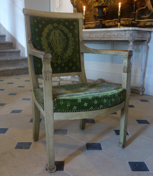 Mobilier de salon en bois mouluré, sculpté et laqué d'époque Consulat ou époque Empire veres 1800 - 1805. Il est composé de 4 fauteuils et de 4 chaises assorties. D'un modèle à l'antique, les montants antérieurs reprennent les formes des glaives romains. Les montants antérieurs des chaises sont garnis d'une couronne de lauriers.