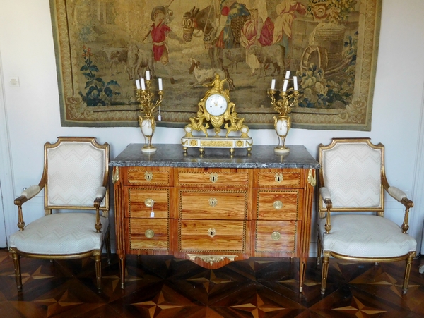 Dossier droit, supports d’accotoirs en en colonne balustre cannelée, pieds cannelés rudentés. Très élégants, nos sièges sont une production de luxe exécutée juste avant la révolution pour les derniers feux de l'ancien régime.