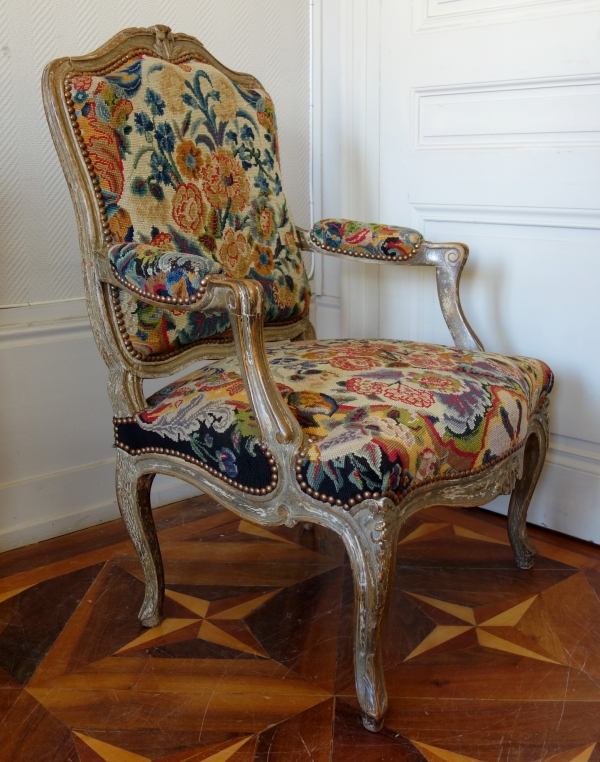 Paire de fauteuils Louis XV dits à la Reine en bois laqué, large modèle de style rocaille à fleurettes. Ils sont ornés d'une belle tapisserie en points de Saint Cyr d'époque XVIIIe siècle.
