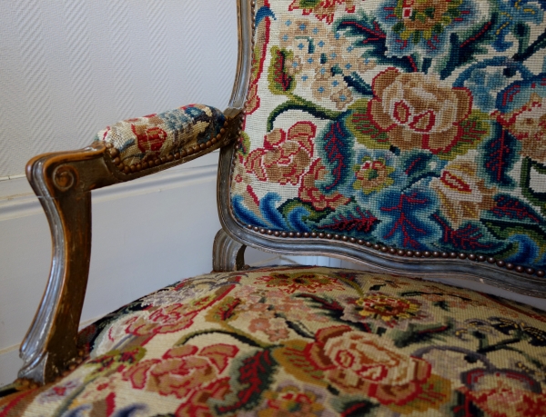 Ces beaux fauteuils de salon sont un ancien travail de style Louis XV du XIXe siècle, probablement des copies parfaites destinées à compléter un mobilier de salon d'époque XVIIIe siècle (scultpure grasse et assemblages chevillés partout. Avec leur tapisserie XVIIIe, ils permettent de constituer un parfait complément d'un décor du XVIIIe siècle, mais pour un coût d'acquisition bien plus accessible.