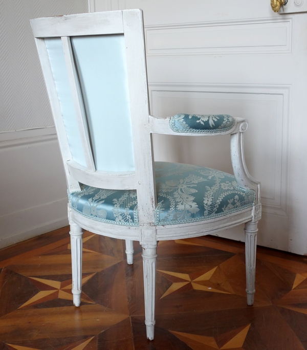 Série de 4 fauteuils cabriolets à dossier droit dit en fer de pelle, pieds cannelés rudentés.