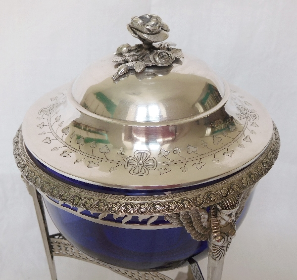 Grand drageoir ou confiturier en argent massif et cristal de Baccarat bleu cobalt, époque Consulat.