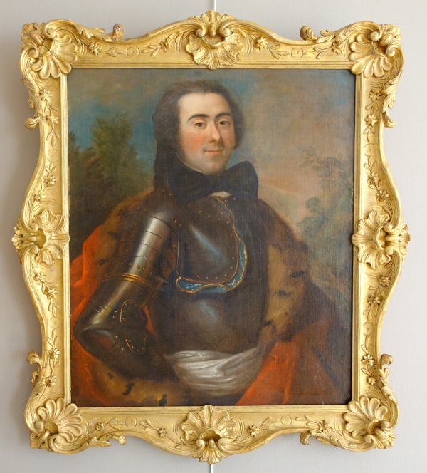 Ecole Française du XVIIIe siècle, grand portrait - huile sur toile - d'un officier aristocrate en cuirasse, noeud papillon noir et perruque, début de l'époque Louis XV vers 1740. Il est présenté dans un très beau cadre Rocaille en bois sculpté et doré, travail provençal du milieu XVIIIe siècle.