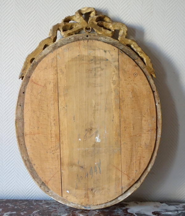 Pastel, notre tableau est présenté dans son cadre d'origine : un riche modèle de format ovale en bois sculpté et doré à la feuille d'or, surmonté d'un ruban plissé. Vers 1780